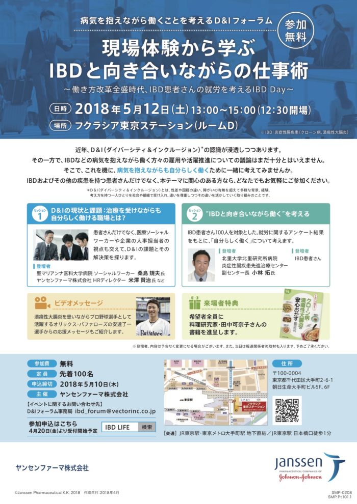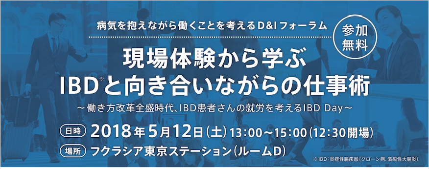 2018年5月12日(土)に東京で開催される、『現場体験から学ぶ-IBDと向き合いながらの仕事術』に潰瘍性大腸炎の代表者として出演することになりました!